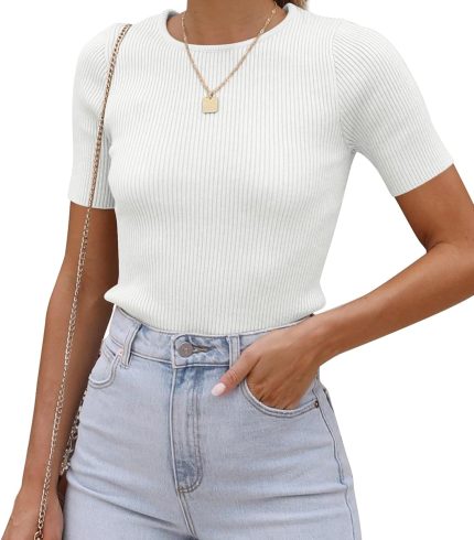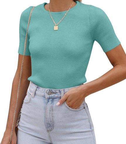 Women’s Tops Short Sleeve Trendy Ribbed Knit Basic Tshirts