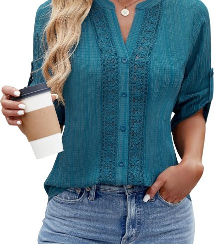Women’s Tshirts V Neck Short Sleeve Buttons Tops Tee Solid Color Blouse Loose Fit