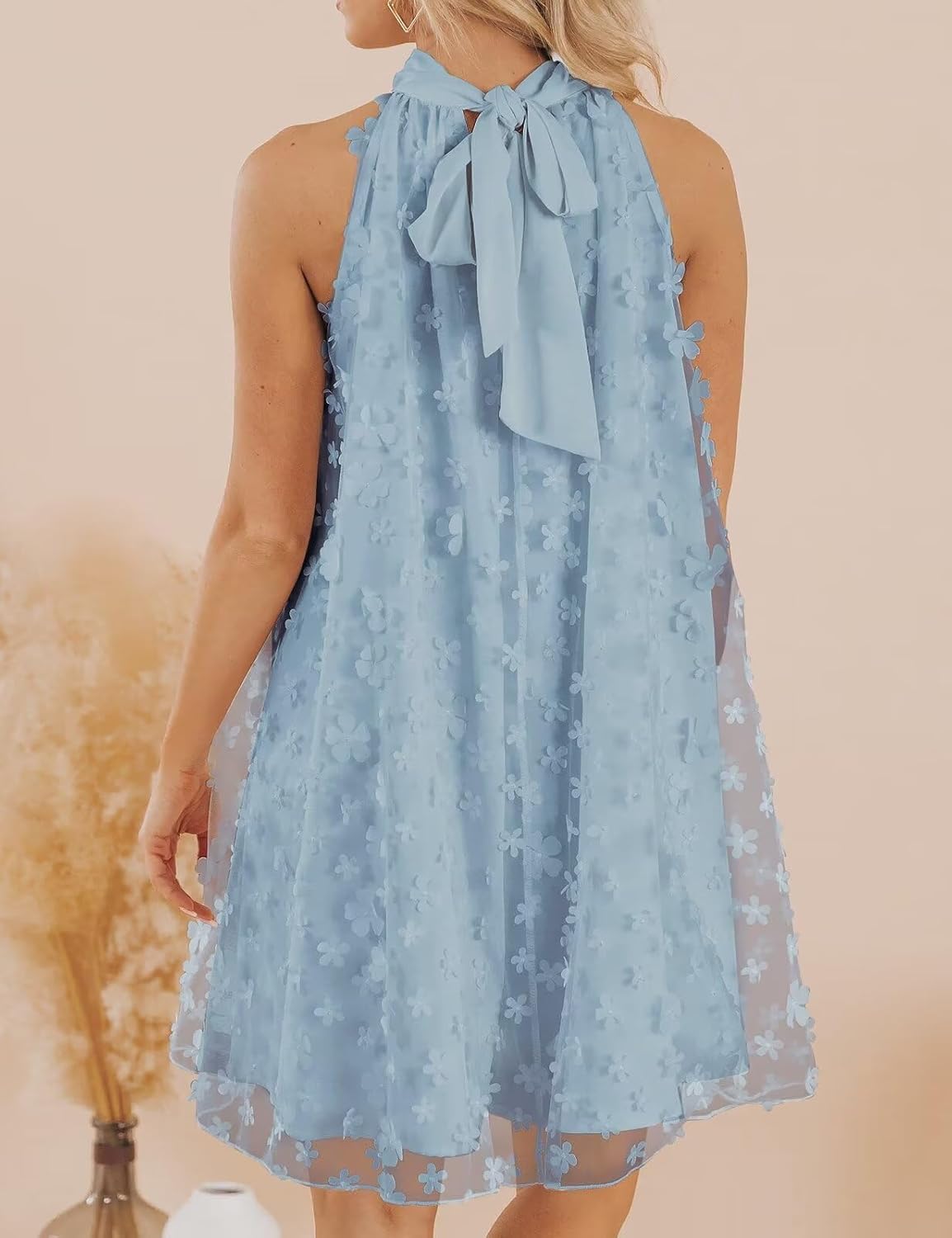 - The fashion halter neck dress is made of chiffon fabric, with a layer of 3D flower appliques tulle on the outside, giving a more three-dimensional and textured feel.