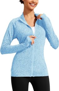 - FULL-ZIP & THUMBHOLES: These slim fit running jackets are coming with a stand-up collar and thumb holes to keep your sleeves from riding up and guard against wind chill. When outdoor running, walk or indoor workout, tie it around the chin and zip down to let a little air in as you warm up.