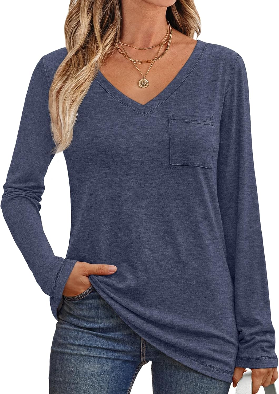 - Features:V neck t Shirts,Chest pockets,Casual workout tops/lounge tops/Soild color/Basic tee/Plain tops for leggings/Everyday Wear,trendy fall winter shirts outfits for women.