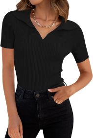 - Elevate your casual wardrobe with our fashion tops featuring a trendy polo V-neck design, adding a touch of sophistication to your everyday outfits. Slim fitted t-shirts are designed to enhance your curves and flatter your figure, making you feel confident and stylish. Soft ribbed knit texture adds a touch of modern fashion to these classic wardrobe staples.