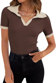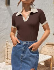 - Elevate your casual wardrobe with our fashion tops featuring a trendy polo V-neck design, adding a touch of sophistication to your everyday outfits. Slim fitted t-shirts are designed to enhance your curves and flatter your figure, making you feel confident and stylish. Soft ribbed knit texture adds a touch of modern fashion to these classic wardrobe staples.