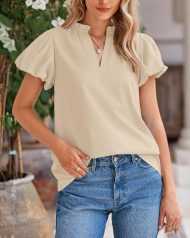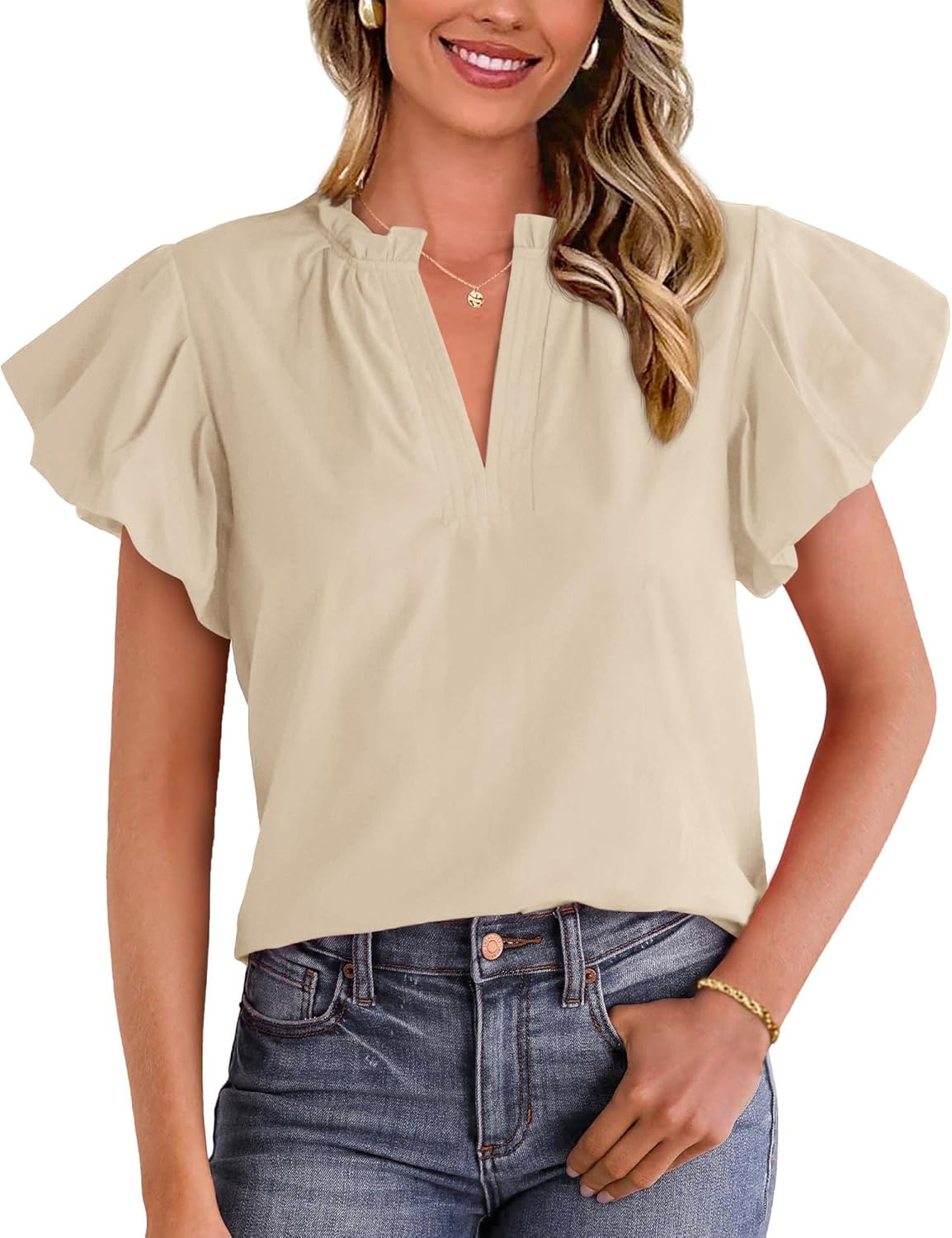 - FEATURES: S=US 4-6, M=US 8-10, L=US 12-14, XL=US 16-18, XXL=US 20 / Summer Tops For Women 2025 / Womens Tops / Work Tops For Women / Frill Trim Collar / V Neck / Puff Short Sleeve / Loose / Lightweight / Solid Color