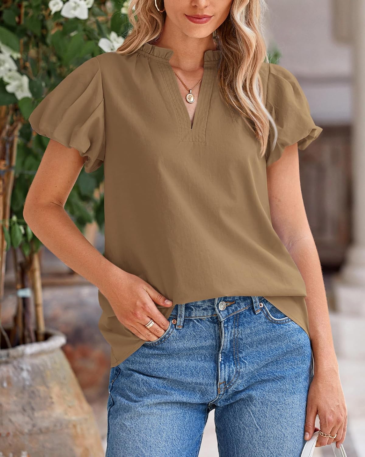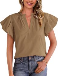 • FEATURES: S=US 4-6, M=US 8-10, L=US 12-14, XL=US 16-18, XXL=US 20 / Summer Tops For Women 2025 / Womens Tops / Work Tops For Women / Frill Trim Collar / V Neck / Puff Short Sleeve / Loose / Lightweight / Solid Color