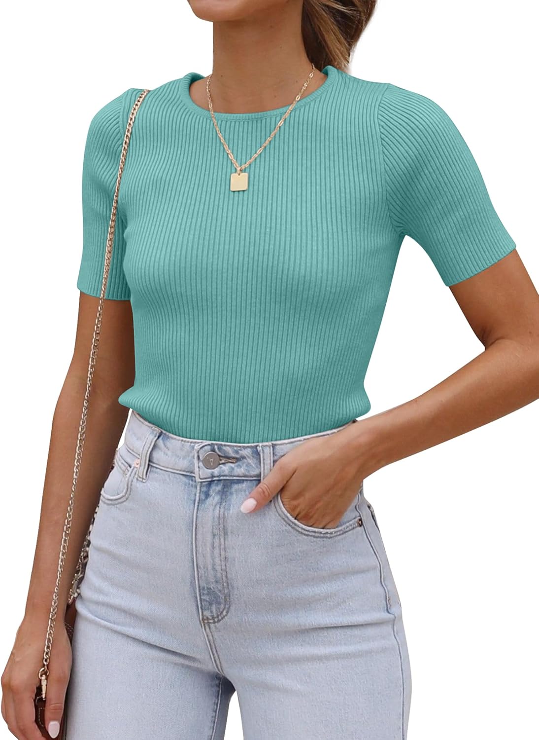 Women’s Tops Short Sleeve Trendy Ribbed Knit Basic Tshirts